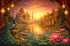 Schwarzer „Theater of Illusions“-Anhänger mit bunten Glasfenstern und blauer Beleuchtung in der Nacht.